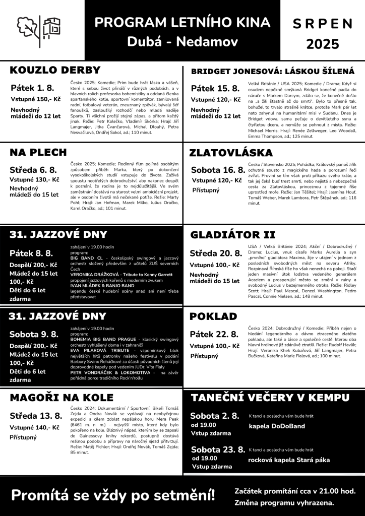 Vstupné je rozmanité a promítání začíná cca po západu slunce, což bývá kolem 21:30 hod. Přijďte si užít příjemné letní večery s dobrou zábavou!